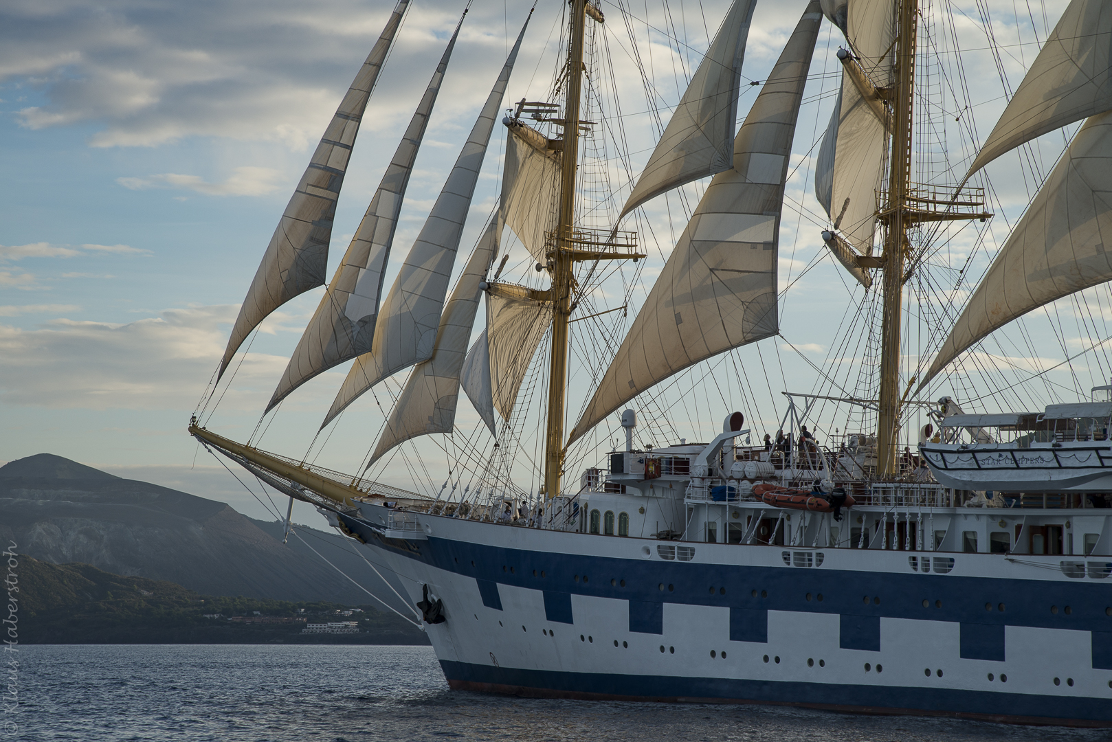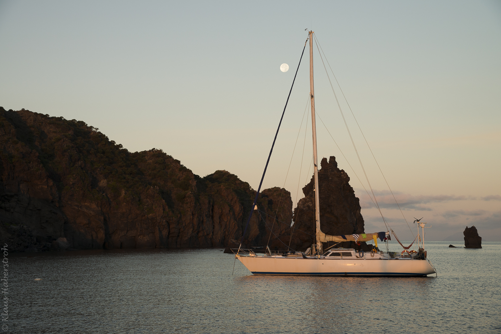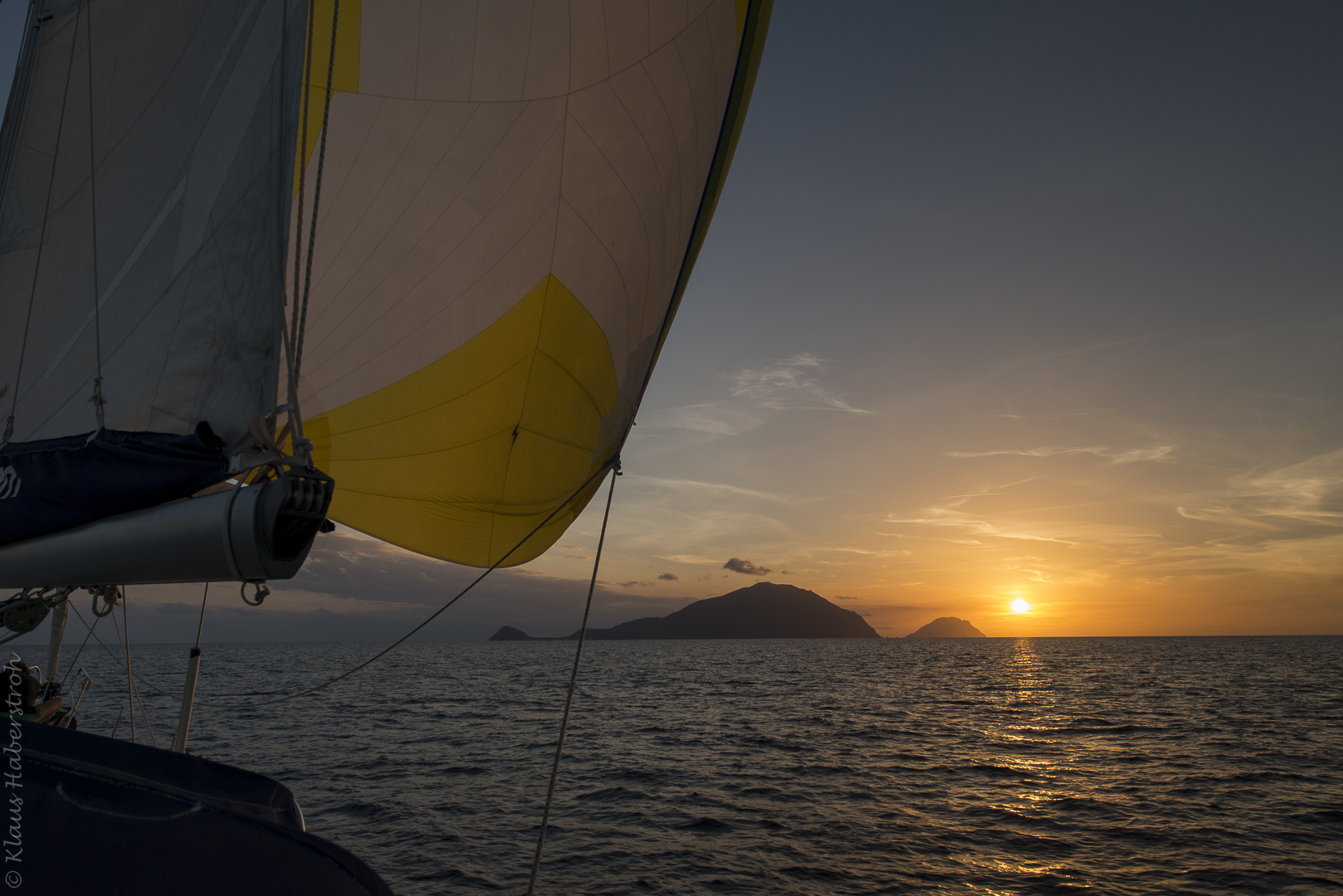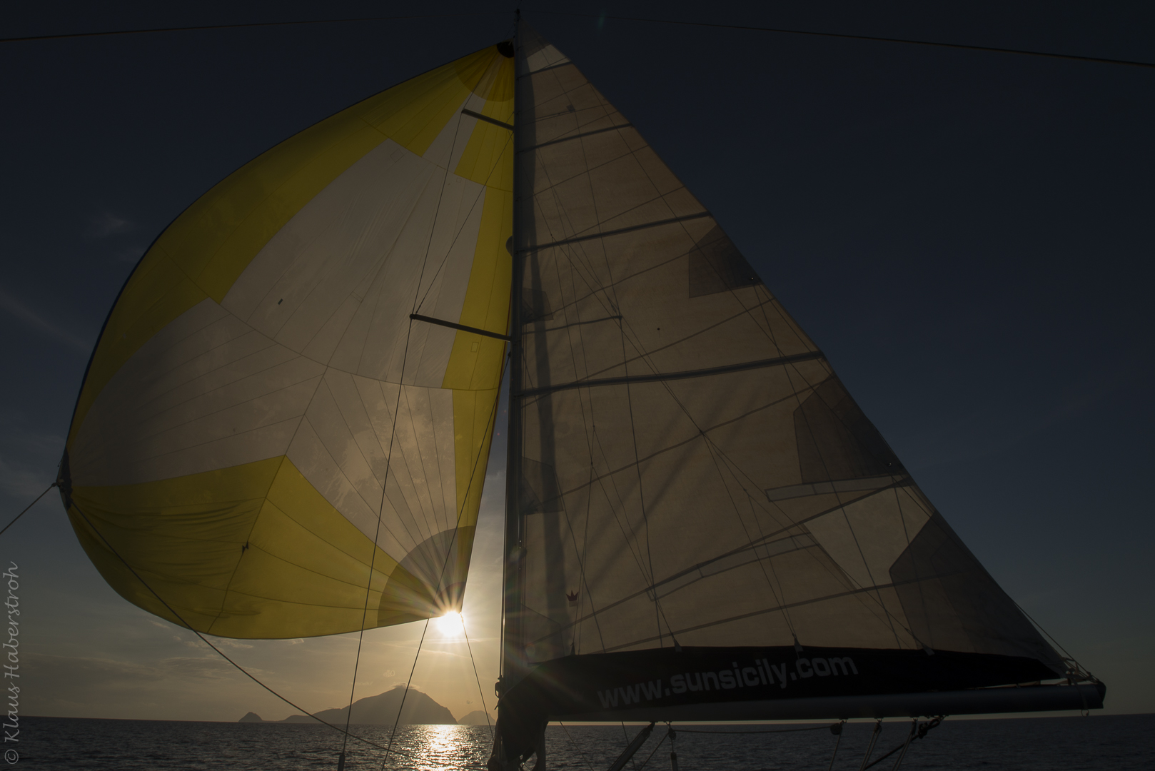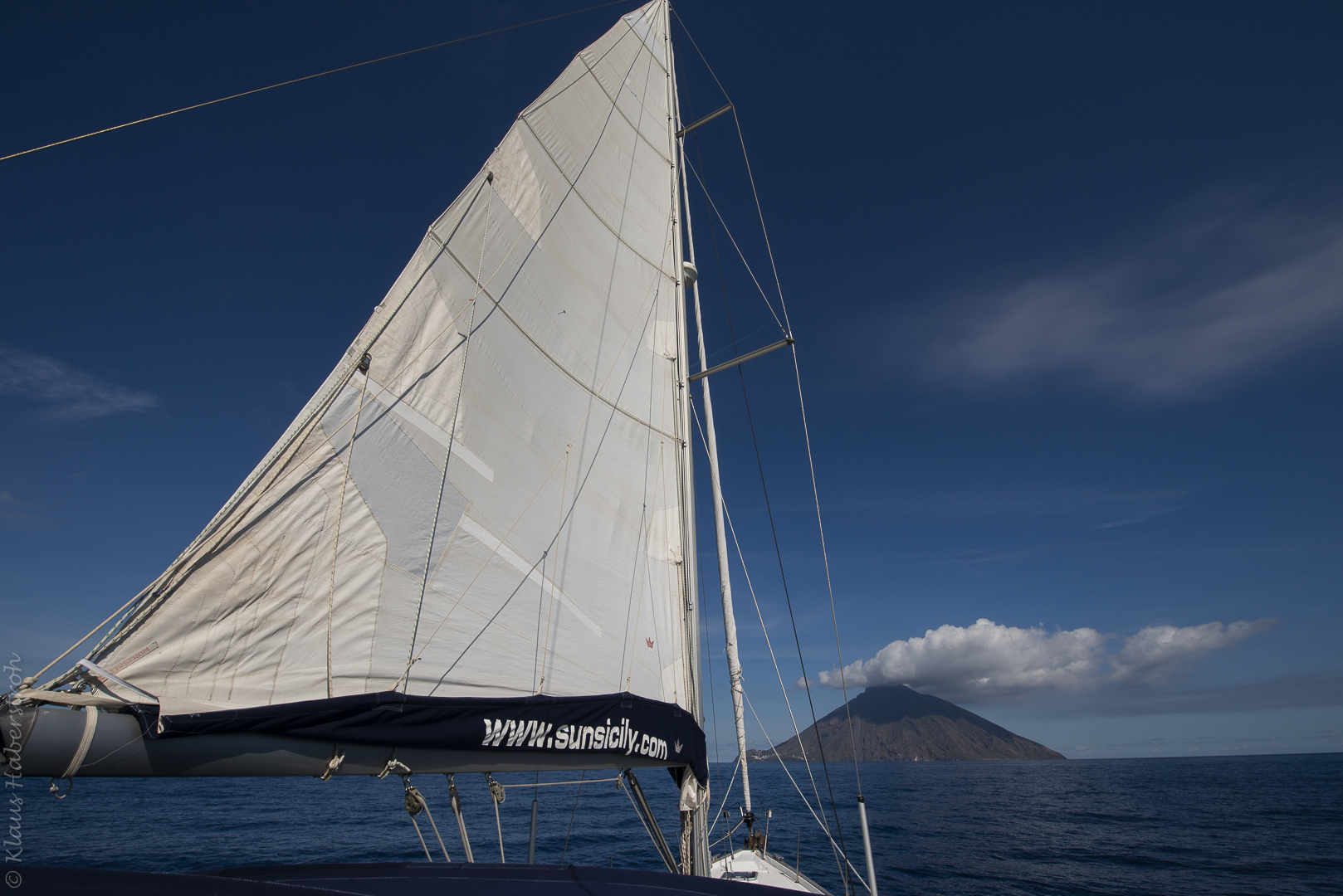 In Sizilien ist es im Oktober noch sommerlich und das Wasser ist noch warm zum Baden. Ein ideales Segelrevier um den Sommer zu verlängern. Vor der Nordküste liegen die Äolischen Inseln oder auch Liparische Inseln genannt. Diese 7 Inseln sind alle vulkanischem Ursprungs und zwei von Ihnen, der Stromboli und Vulcano sind noch aktiv. Es ist Segelrevier mit kurzen Wegen und unvergleichlichen und spannenden Naturschauplätzen. Nachteilig sind die steilen Flanken der Vulkane die sich unter dem Wasser fortsetzen und kaum Ankermöglichkeiten bieten. Aber im Oktober ist nicht mehr viel los, so dass jeder ein Ankerplätzchen findet. Ein Highlight war der 5-Master auf Lipari beim Segel setzten im Abendlicht.