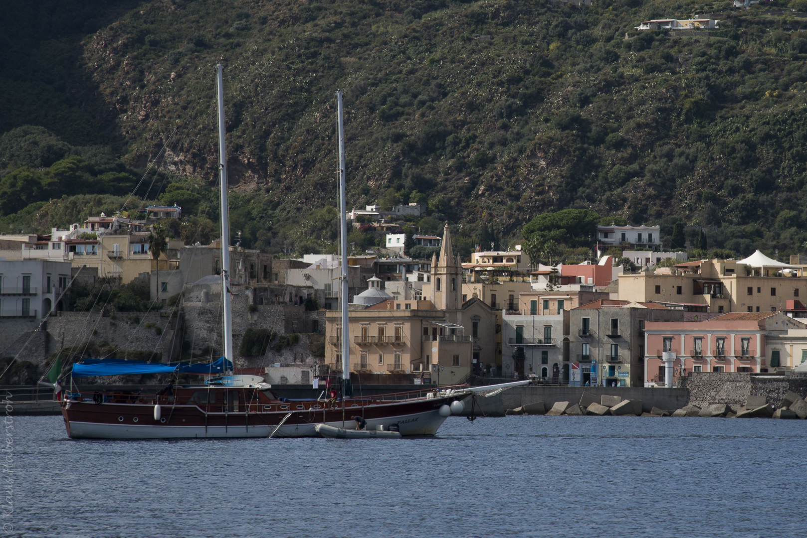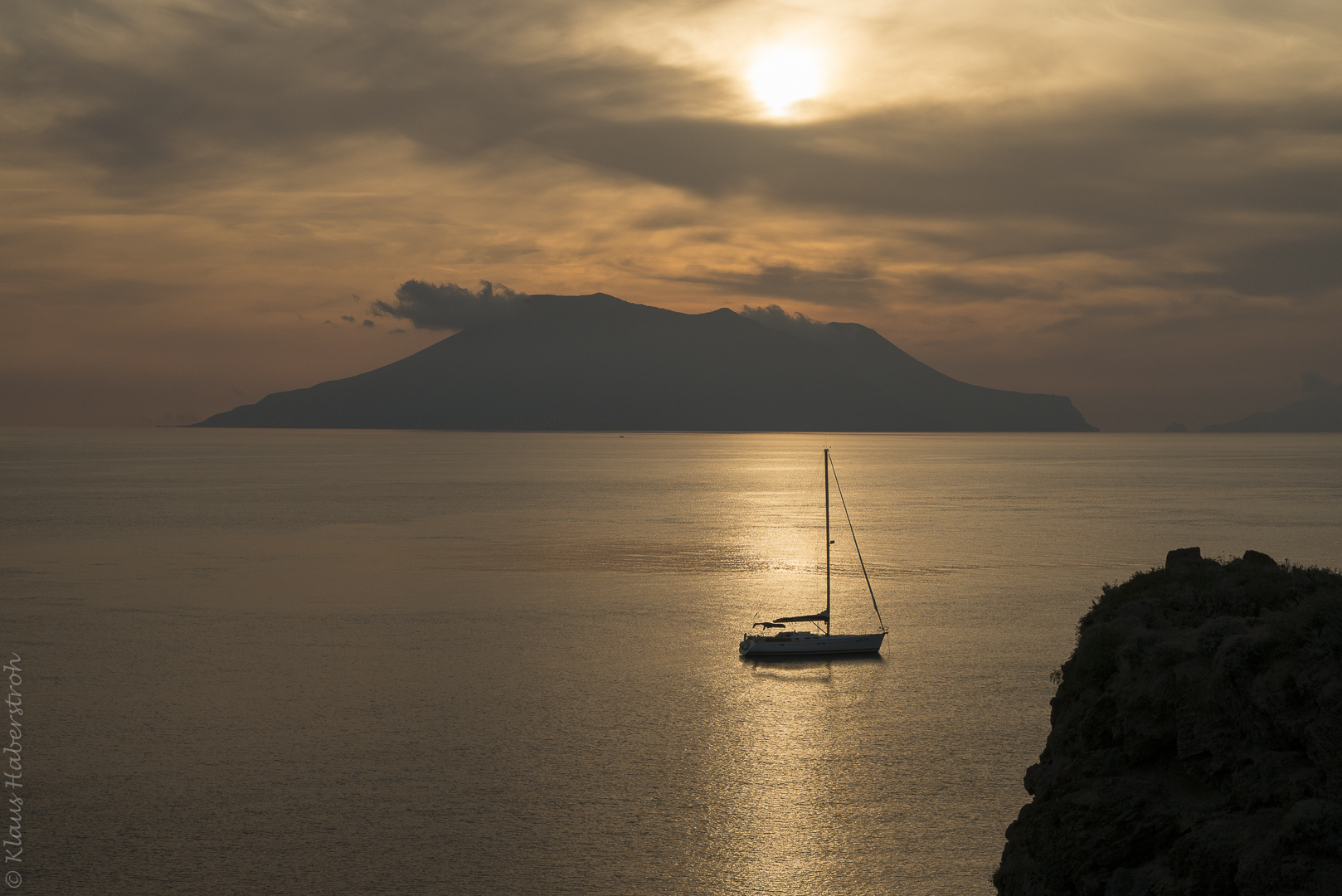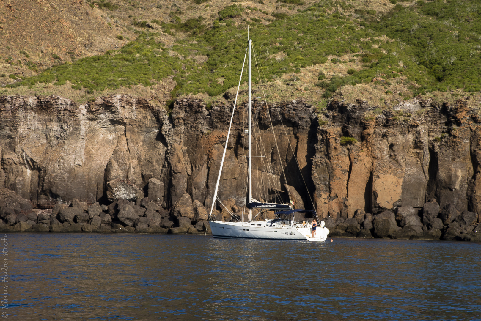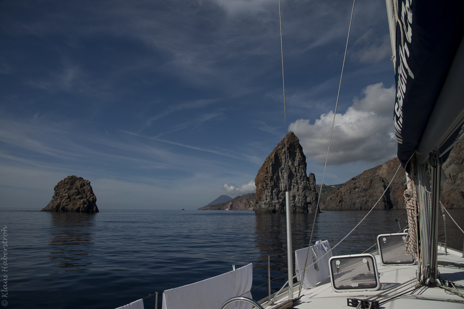 In Sizilien ist es im Oktober noch sommerlich und das Wasser ist noch warm zum Baden. Ein ideales Segelrevier um den Sommer zu verlängern. Vor der Nordküste liegen die Äolischen Inseln oder auch Liparische Inseln genannt. Diese 7 Inseln sind alle vulkanischem Ursprungs und zwei von Ihnen, der Stromboli und Vulcano sind noch aktiv. Es ist Segelrevier mit kurzen Wegen und unvergleichlichen und spannenden Naturschauplätzen. Nachteilig sind die steilen Flanken der Vulkane die sich unter dem Wasser fortsetzen und kaum Ankermöglichkeiten bieten. Aber im Oktober ist nicht mehr viel los, so dass jeder ein Ankerplätzchen findet. Ein Highlight war der 5-Master auf Lipari beim Segel setzten im Abendlicht.