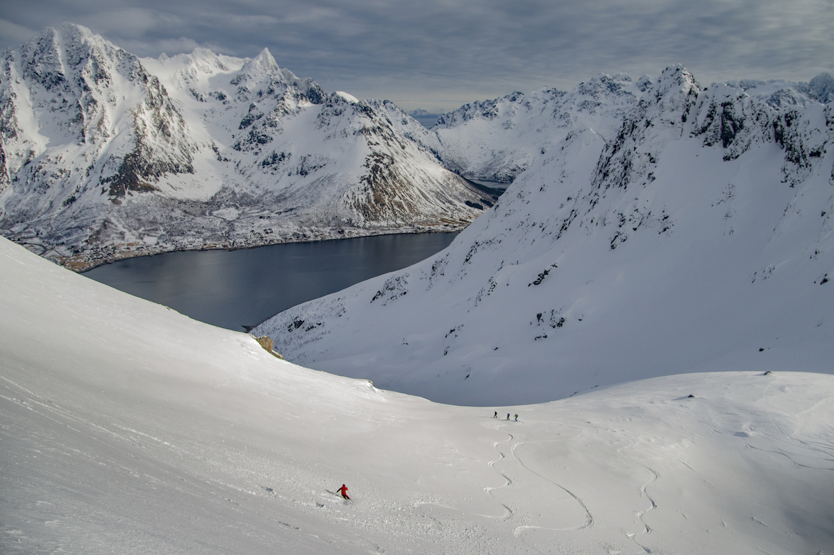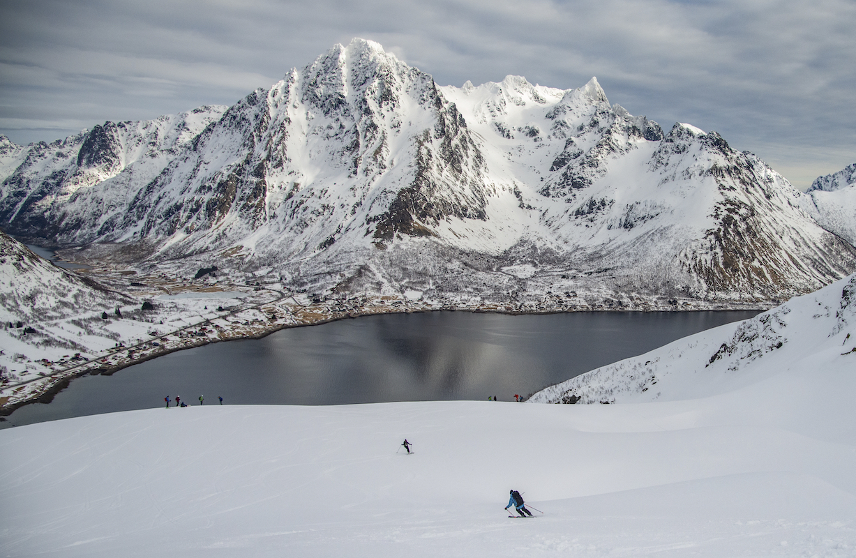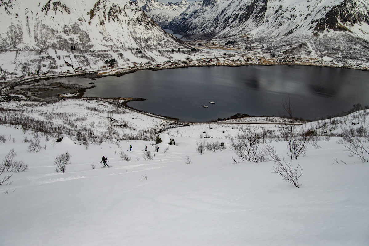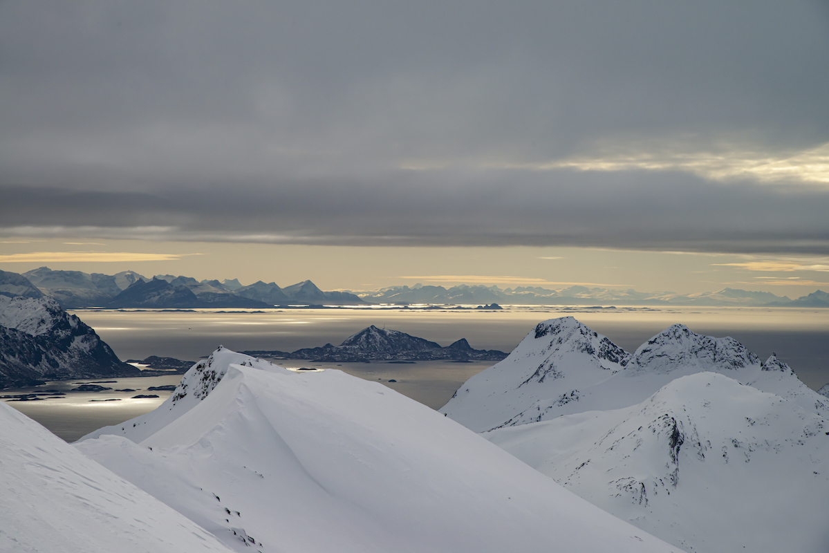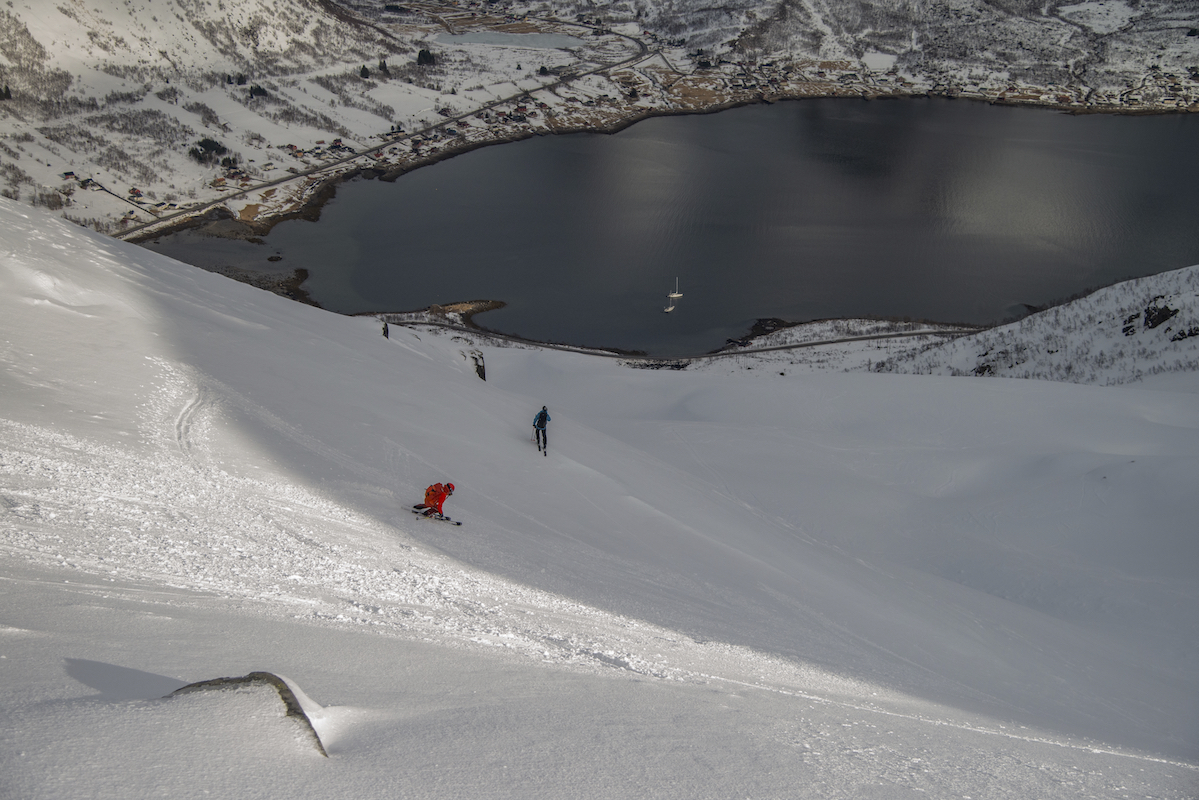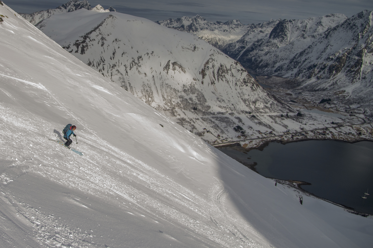 Skitouren auf den Inseln der Lofoten direkt am Atlantik ist ein ganz besonderes Erlebnis. Mit den Skiern in Richtung Meer zufahren und bis an den Strand abzufahren begeistert mich immer wieder. Das flache Licht am 68.Breitengrad und das sich schnell wechselnde Wetter zaubern wundervolle Stimmungen und unvergessliche Momente. Die Schneedecke war trotz hoher Temperaturen seht gut verfestigt und sehr gut zu fahren.